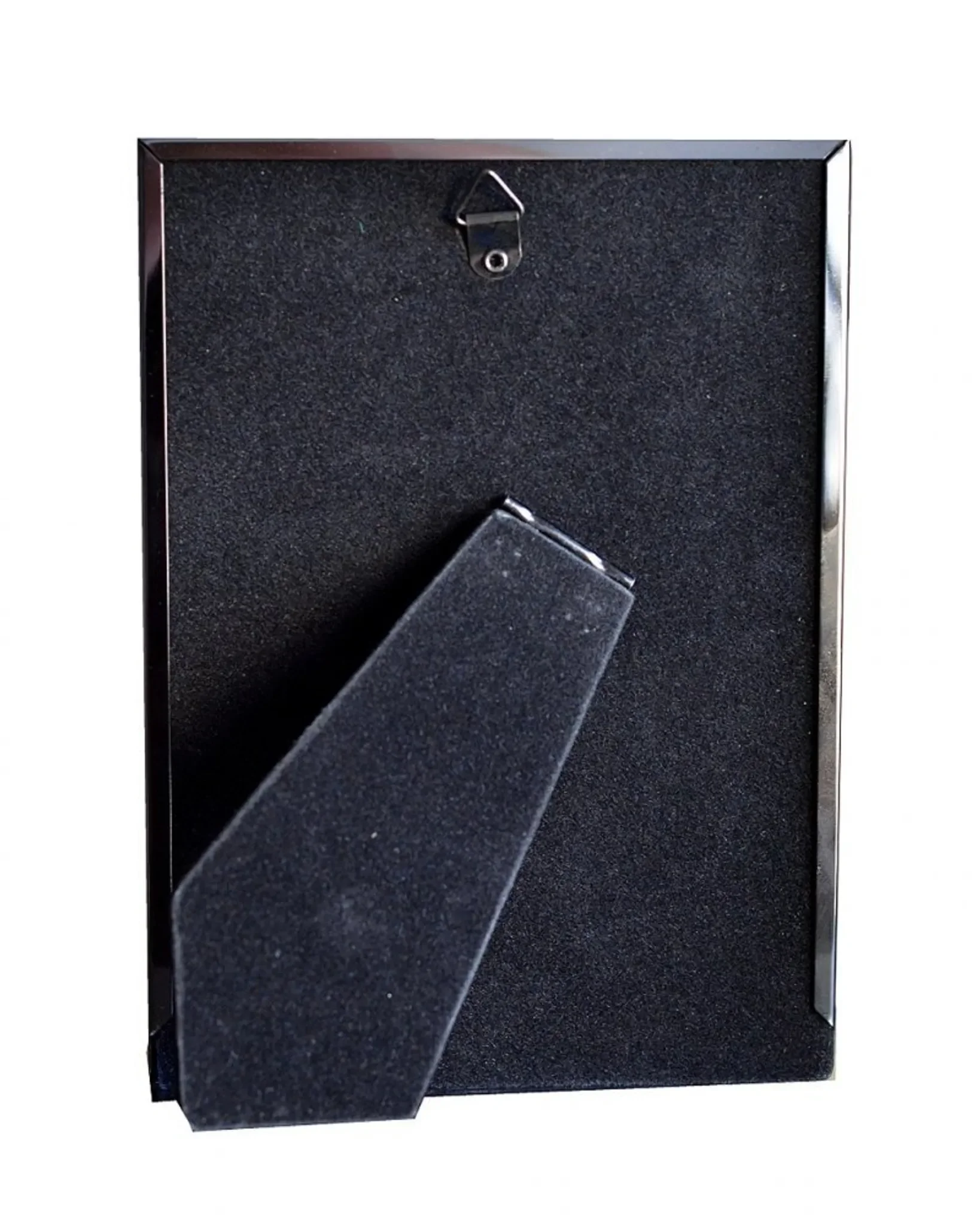 Eleganter Fotorahmen aus mattschwarzem Metall mit einem Flachstab von 0,5 cm Breite und 1,5 cm Tiefe. Die Innenseite der Leiste ist weiß gestaltet, um einen dezenten 3D-Effekt zu erzeugen. Mit Glas und stabiler Rückwand aus schwarzem Wildleder. Kann im Hoch- oder Querformat stehen, hängt aber nur im Hochformat.