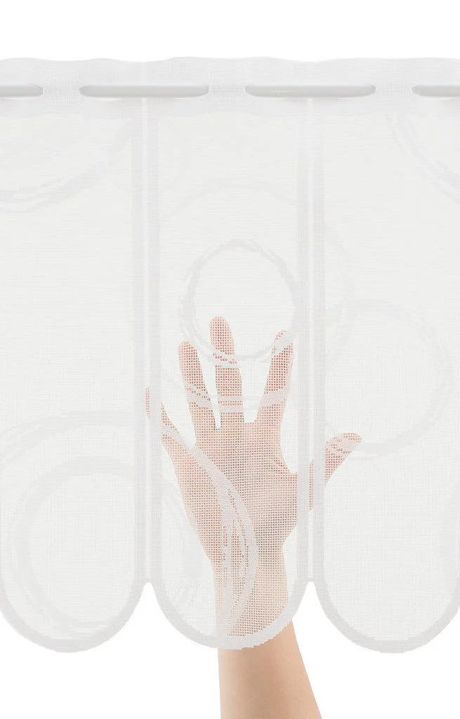 Highlights: Wunschbreite flexibel wählbar • Luftig-transparent • Moderner Kringel-Look • Pflegeleicht & formstabil • Perfekt für Küche, Bad & kleinere Fensterflächen.