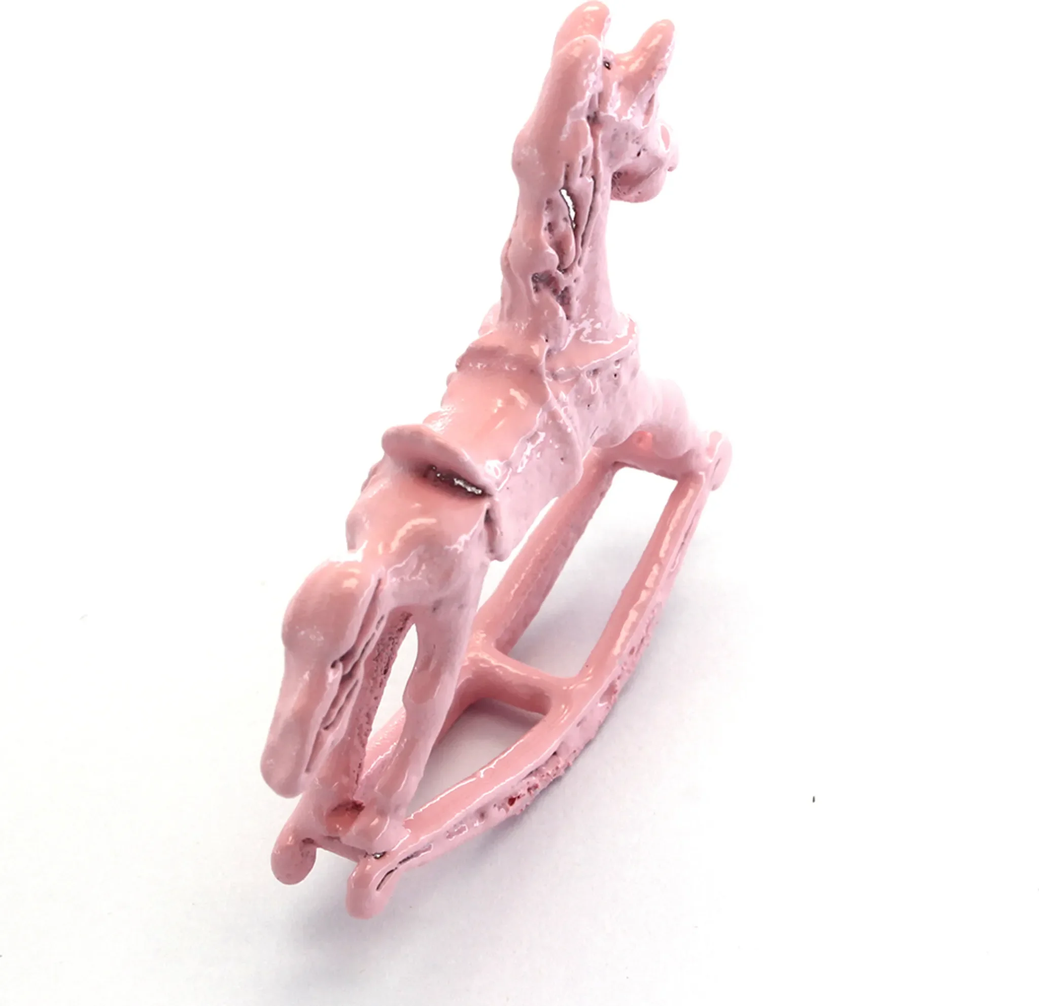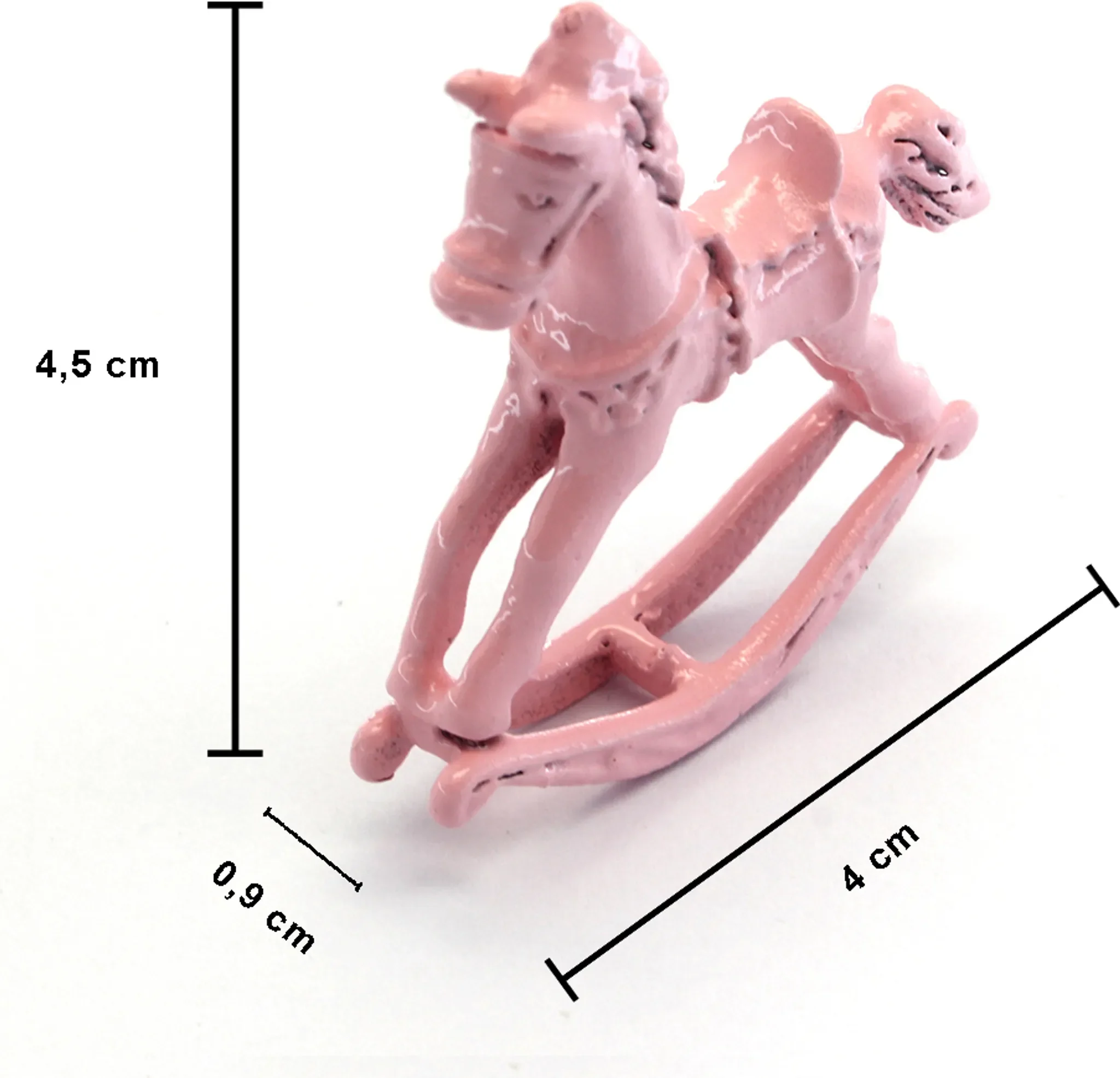 Dieses detailreiche Miniatur-Schaukelpferd aus Metall im Maßstab 1:24 verleiht Puppenhaus-Kinderzimmern eine verspielte und nostalgische Note. Die rosa Farbgebung und die sorgfältige Verarbeitung machen das Stück zu einem besonderen Dekoelement für Sammler und Miniaturliebhaber.