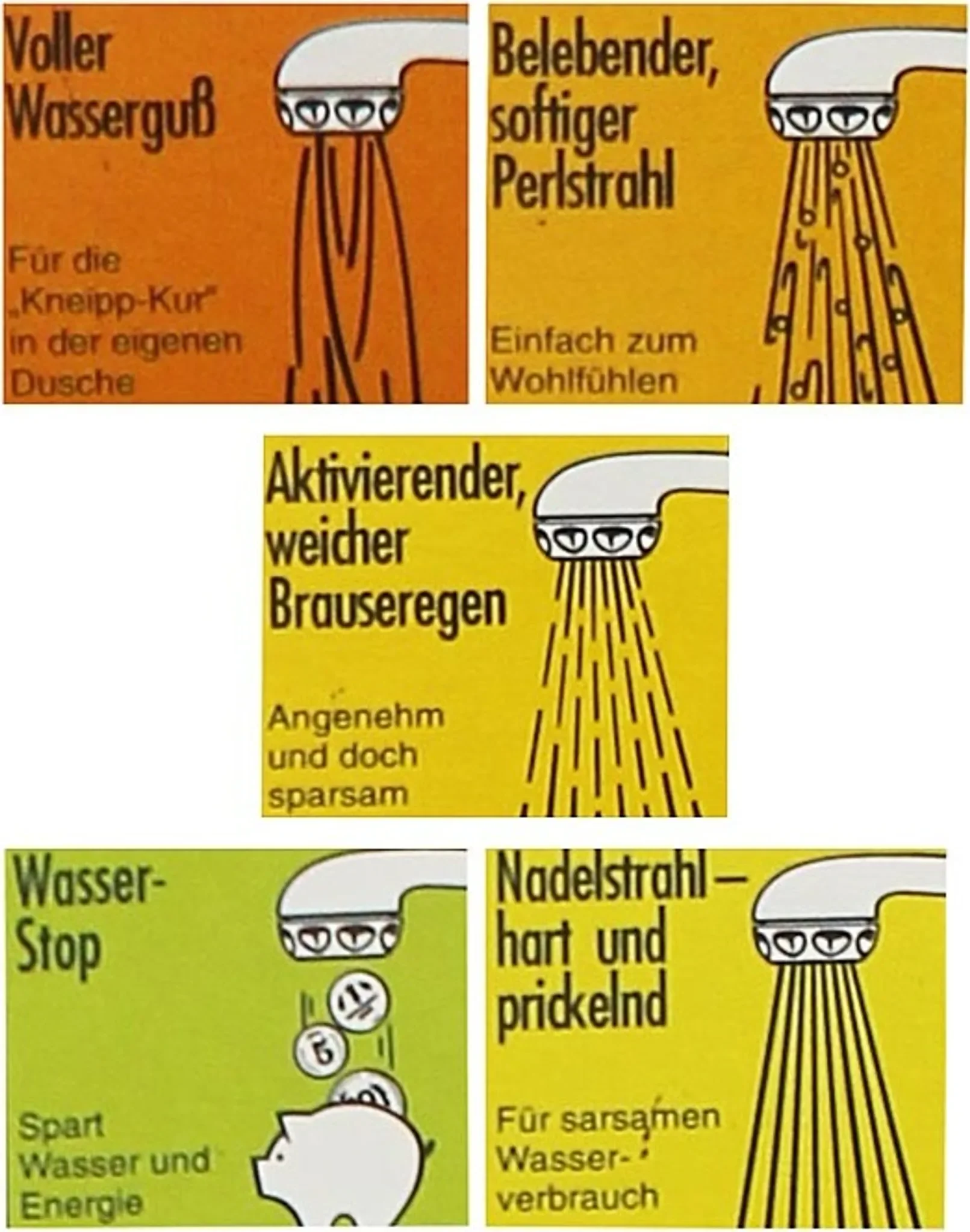 | Funktionen | 5 Strahlarten (Wasserstopp, Nadelstrahl, Brauseregen, Perlstrahl, Wasserguss) |
