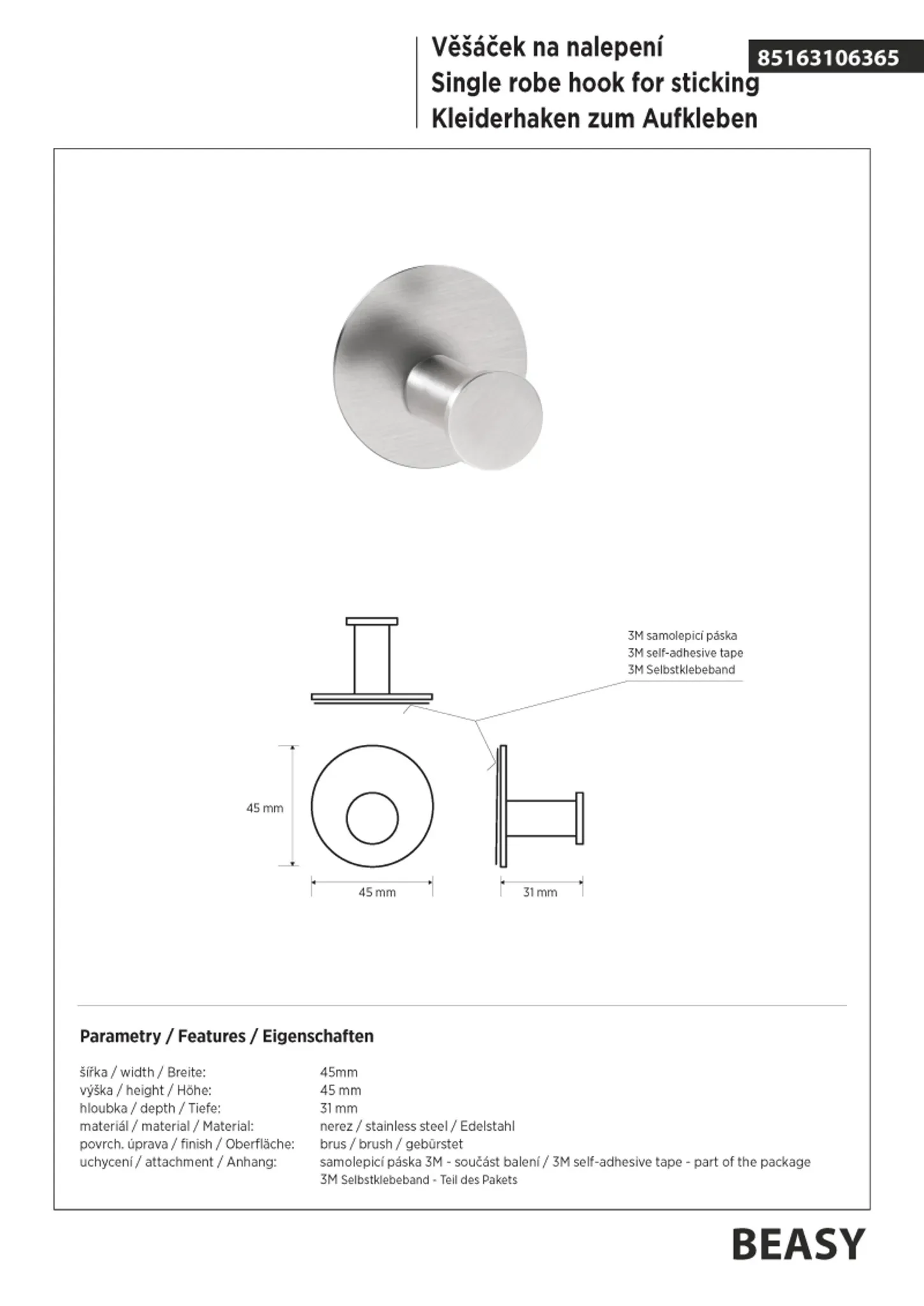 | Im Paket | 1 × Kleiderhaken „BEASY“ aus Edelstahl, selbstklebend |