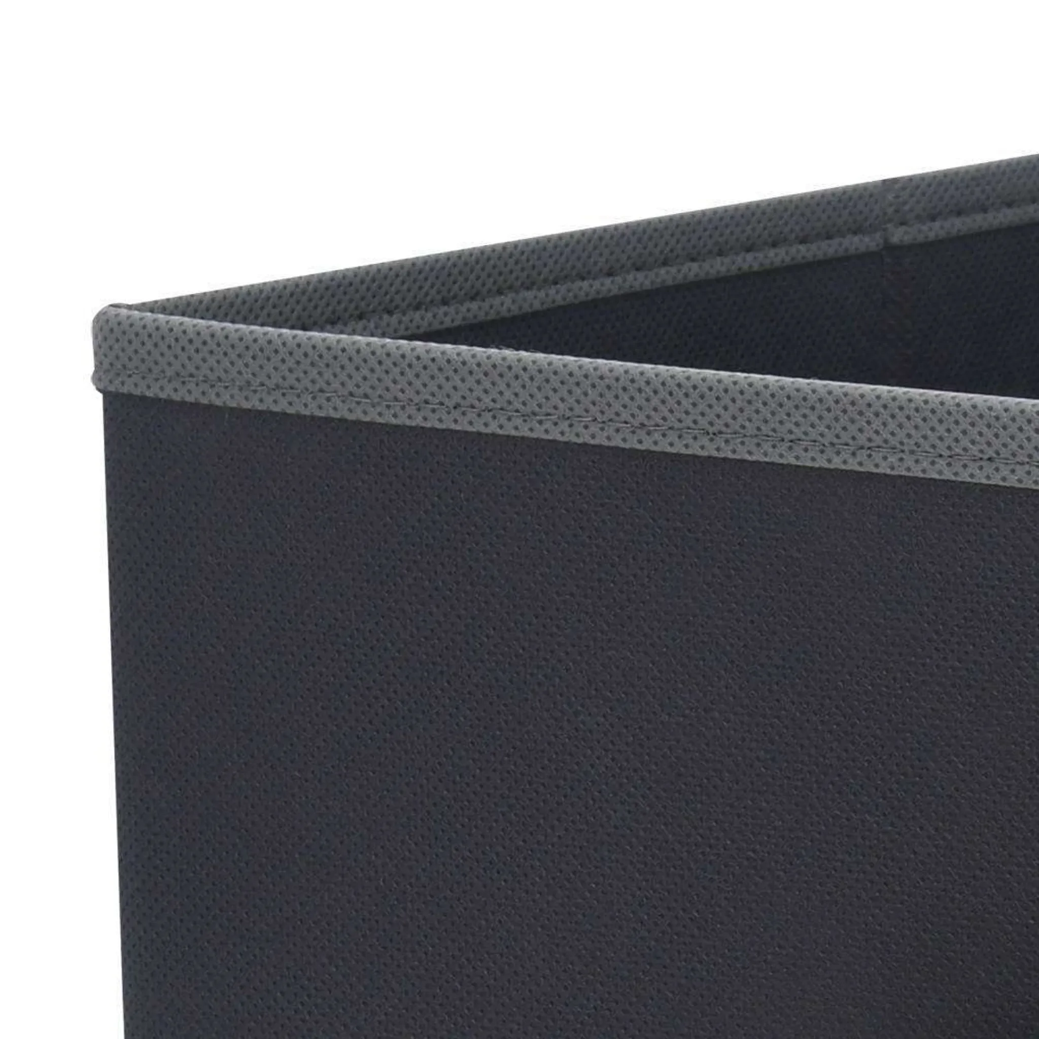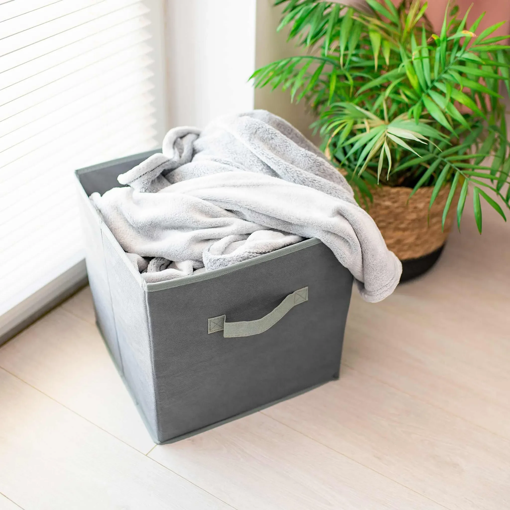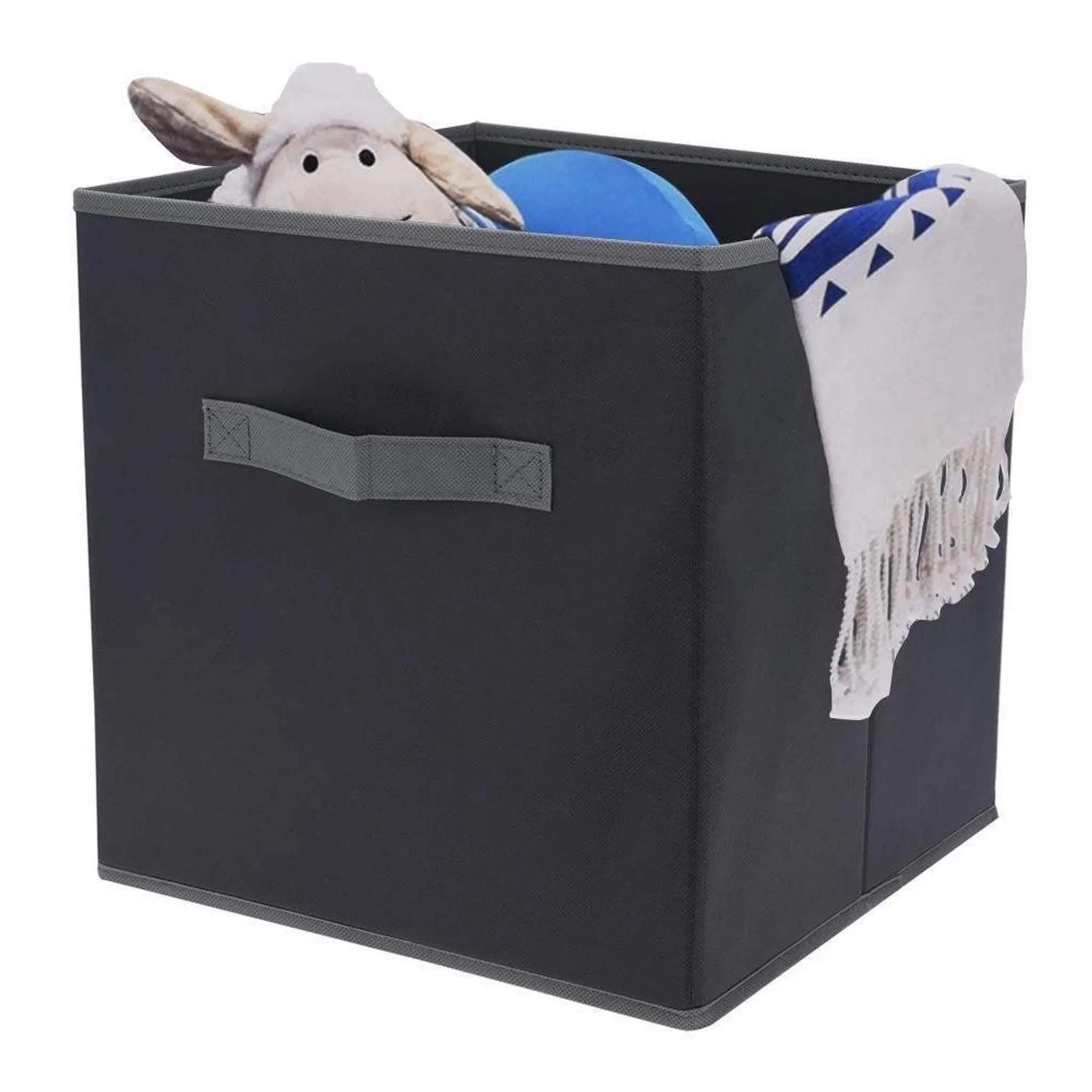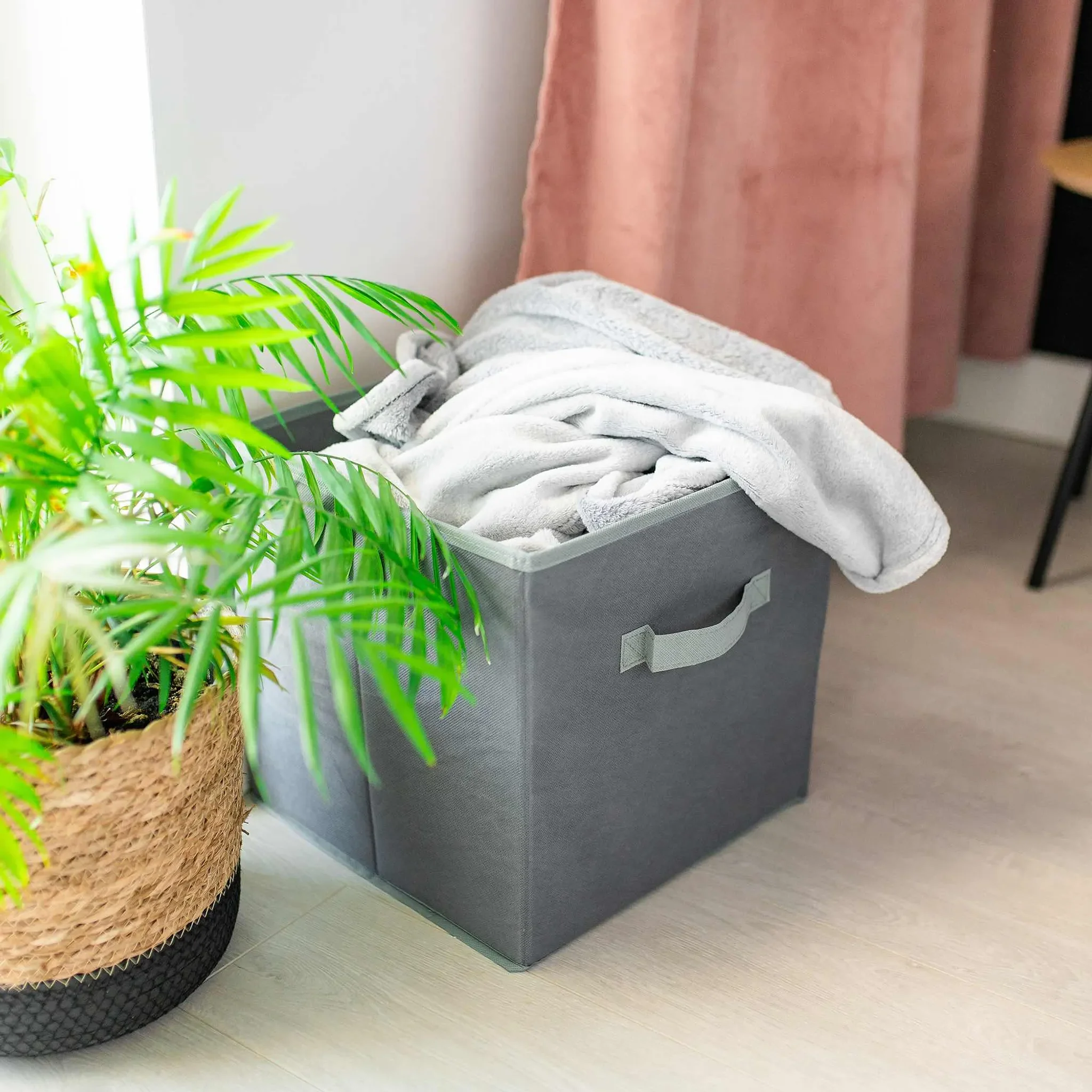 Verstärkte Seitenwände und ein stabiler Boden aus stoffbezogener Pappe halten die Form, während der seitliche Griff das Tragen und Herausziehen erleichtert. Die Box lässt sich platzsparend zusammenfalten und passt perfekt in gängige Regalsysteme.
