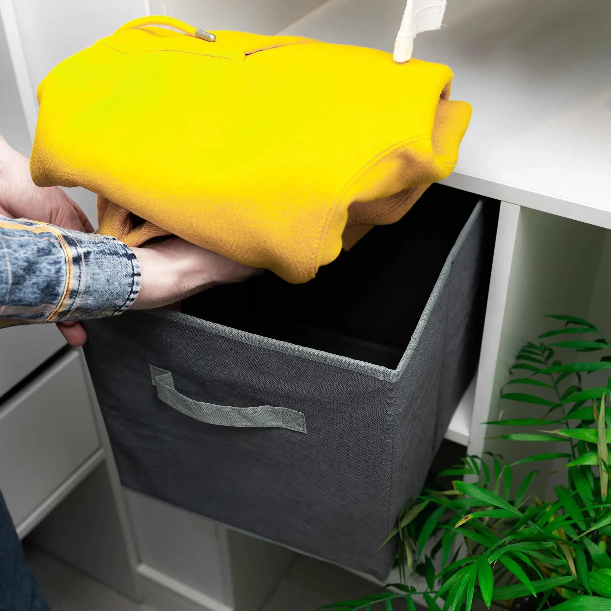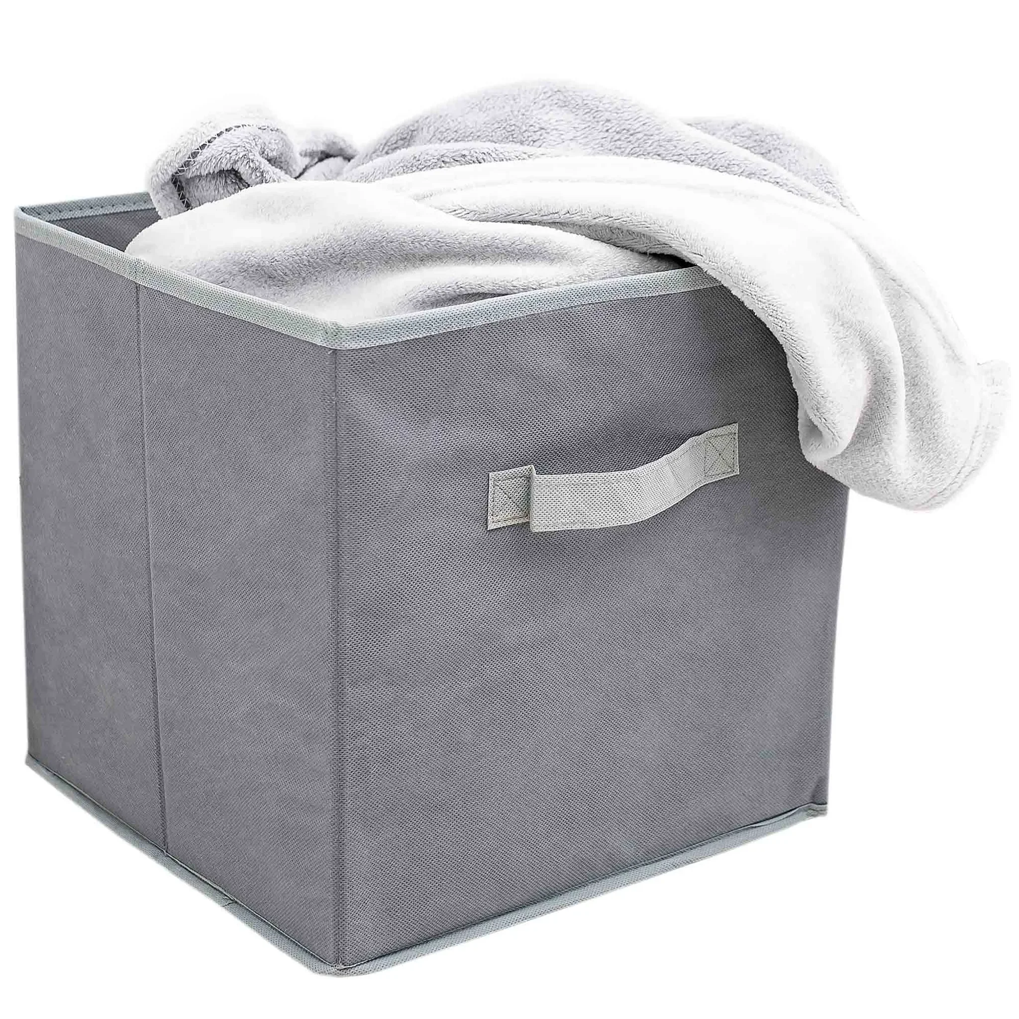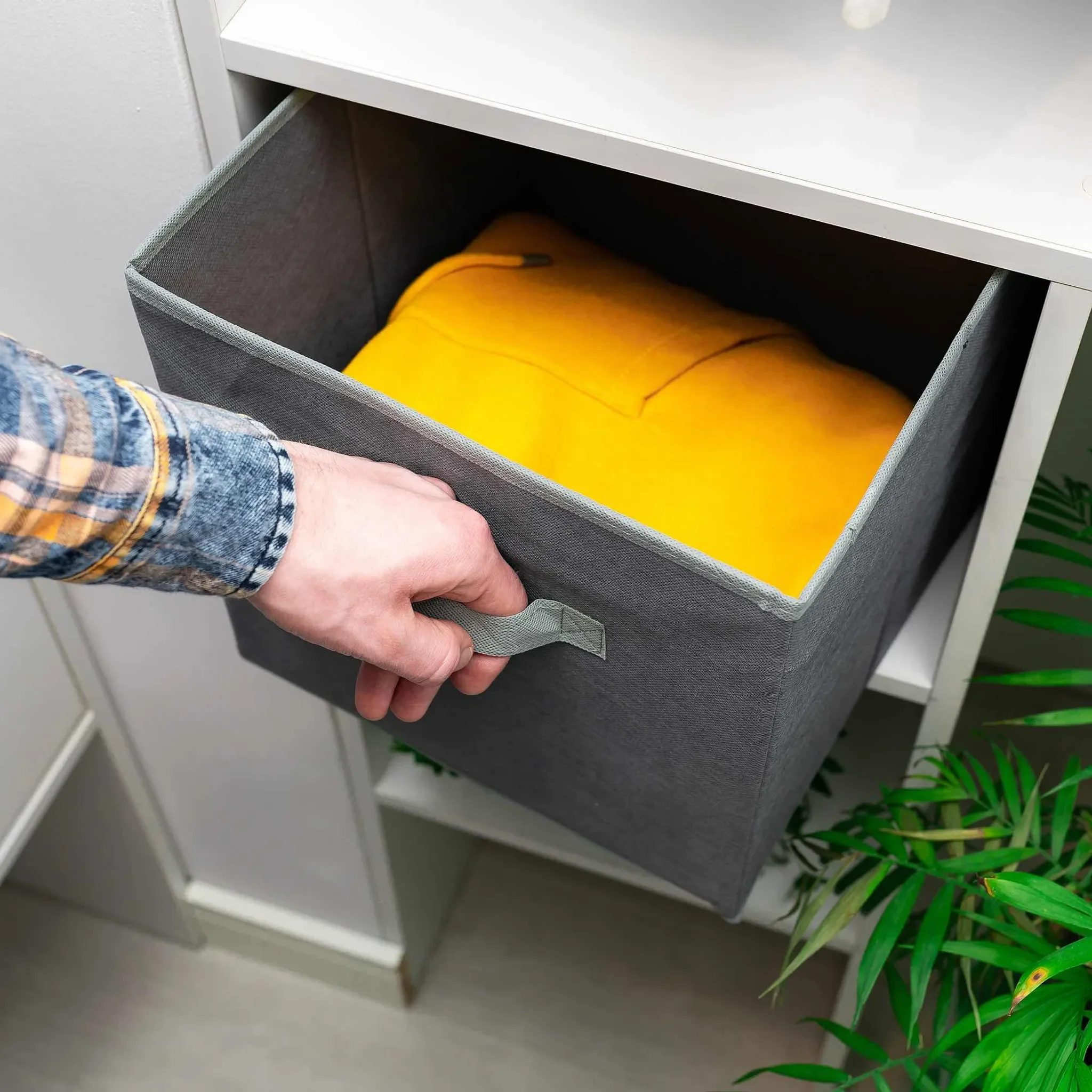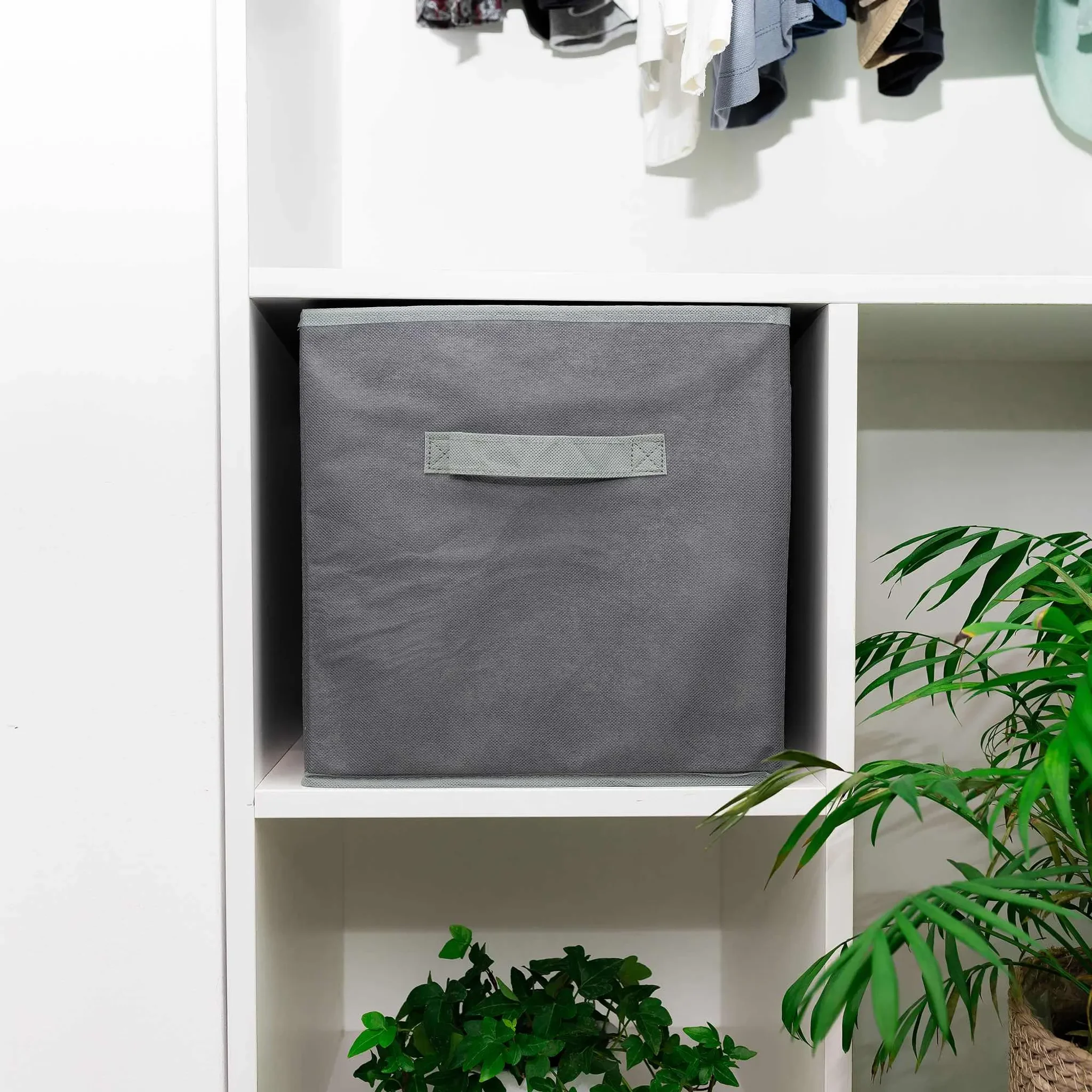 Verstärkte Seitenwände und ein stabiler Boden aus stoffbezogener Pappe halten die Form, während der seitliche Griff das Tragen und Herausziehen erleichtert. Die Box lässt sich platzsparend zusammenfalten und passt perfekt in gängige Regalsysteme.