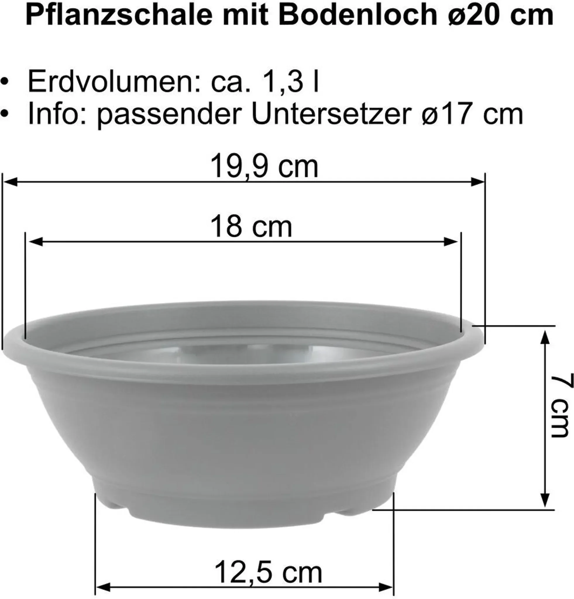 | Im Paket | 1 × MePla Pflanzschale Ø 20 cm mit Bodenloch (anthrazit) |