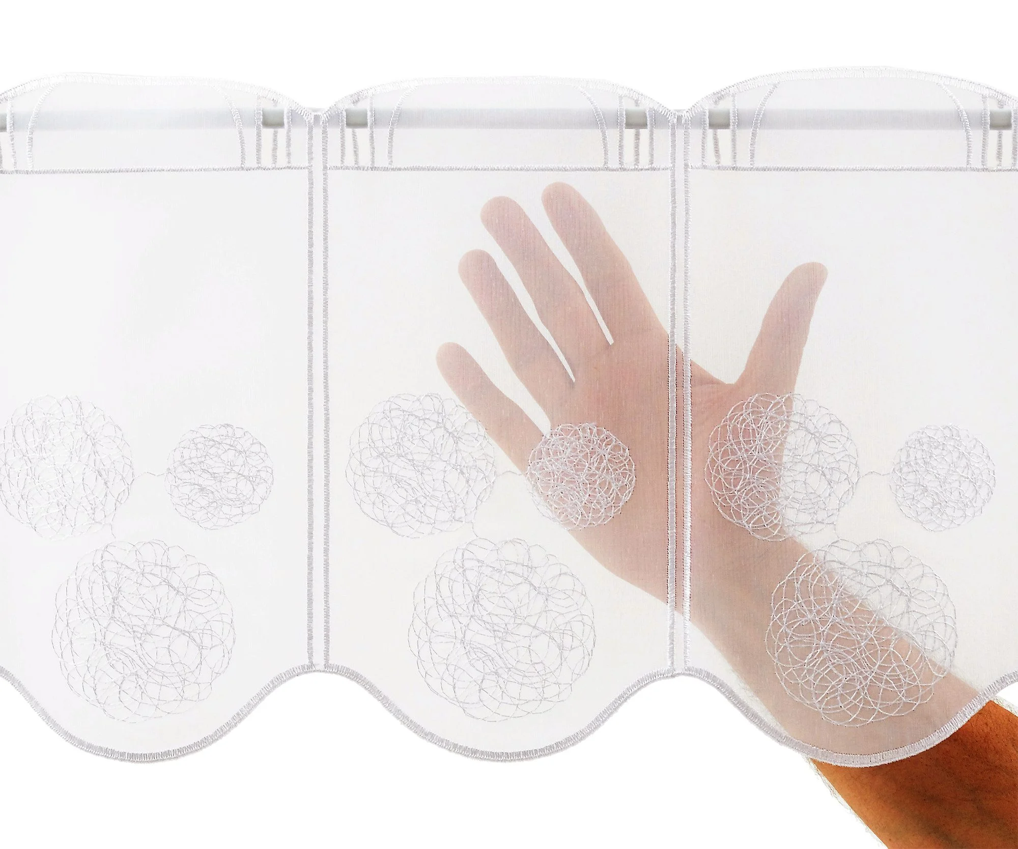 | Im Paket | Scheibengardine „bestickte Kugeln“ in der bestellten Breite (Meterware, Höhe ca. 30 cm) |