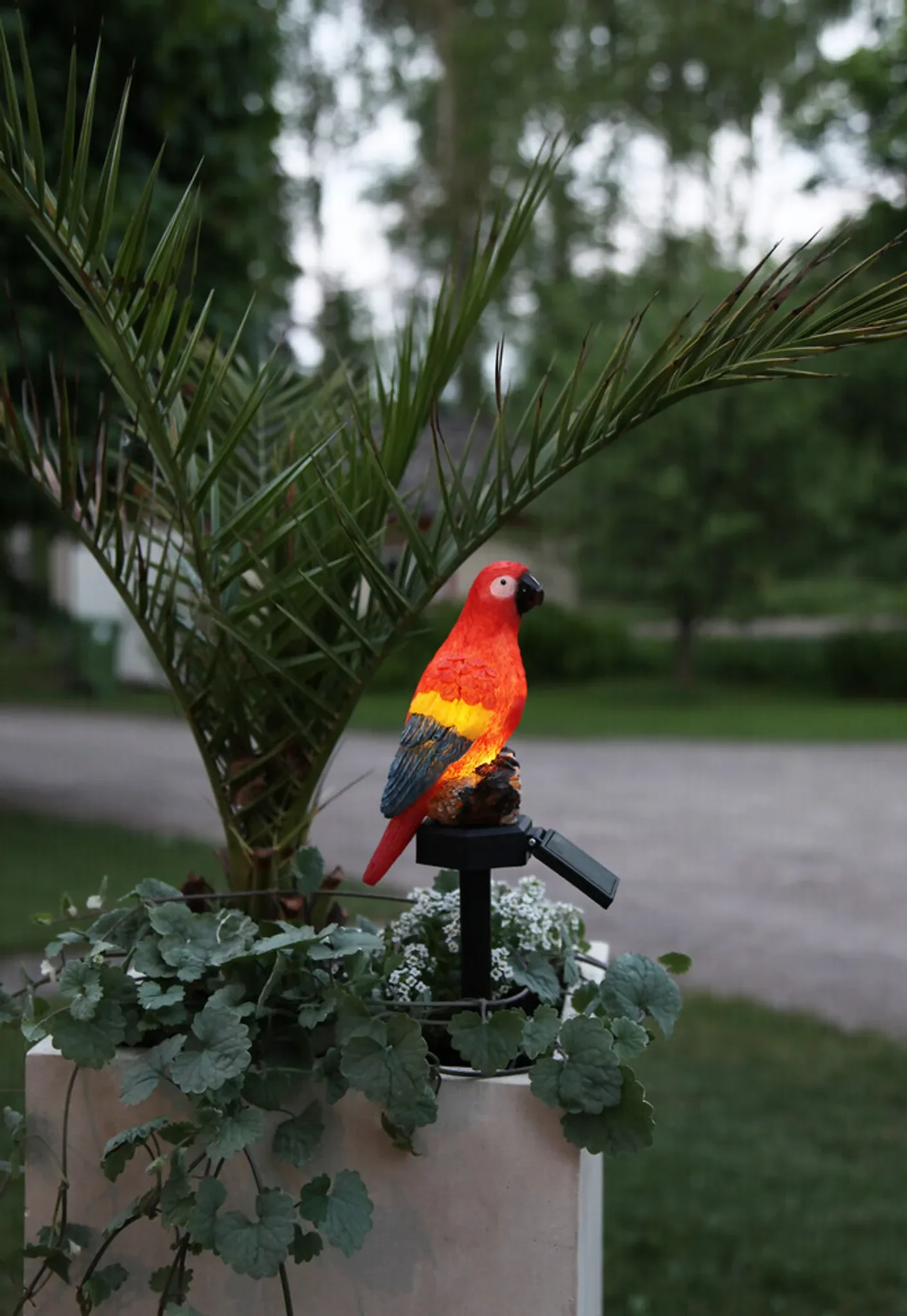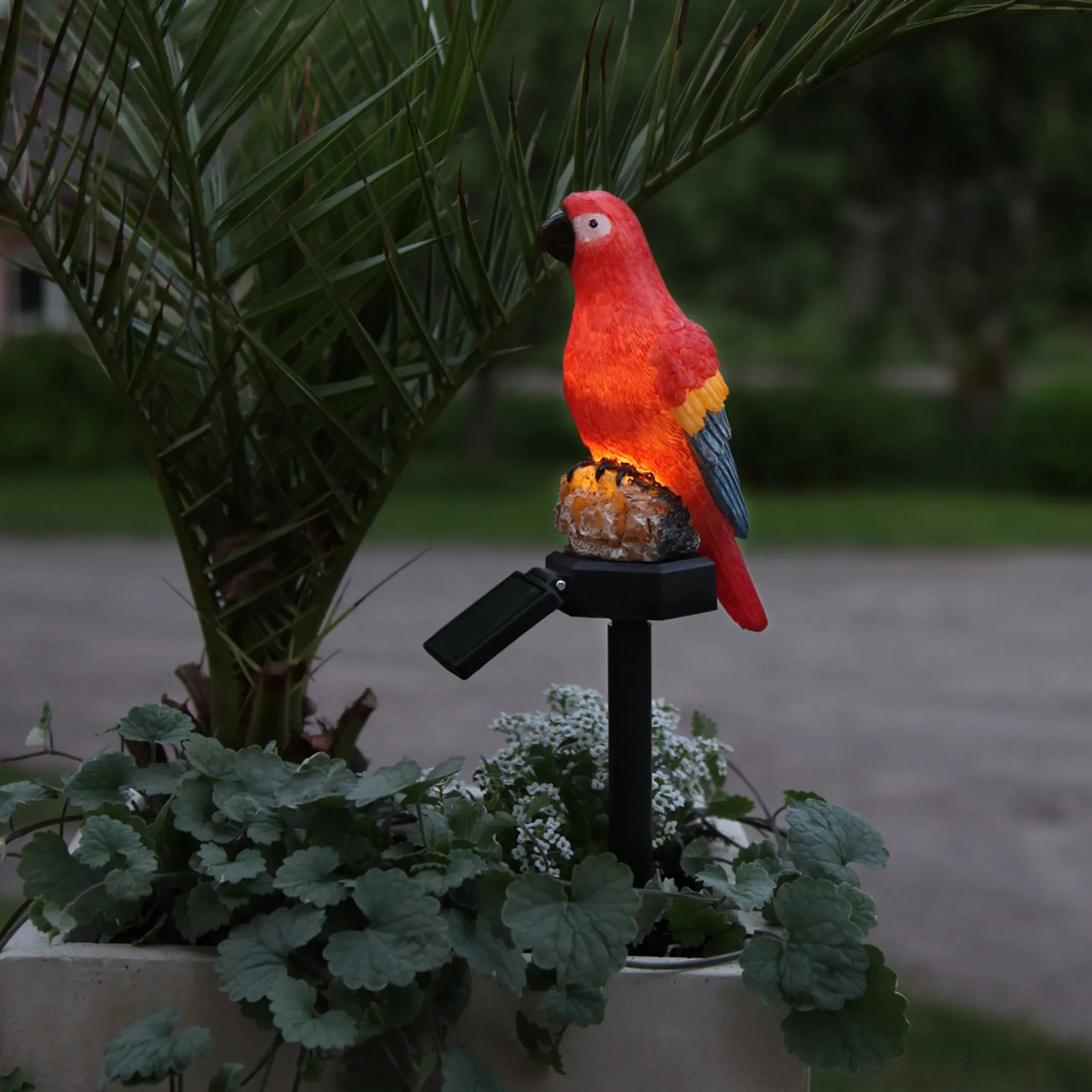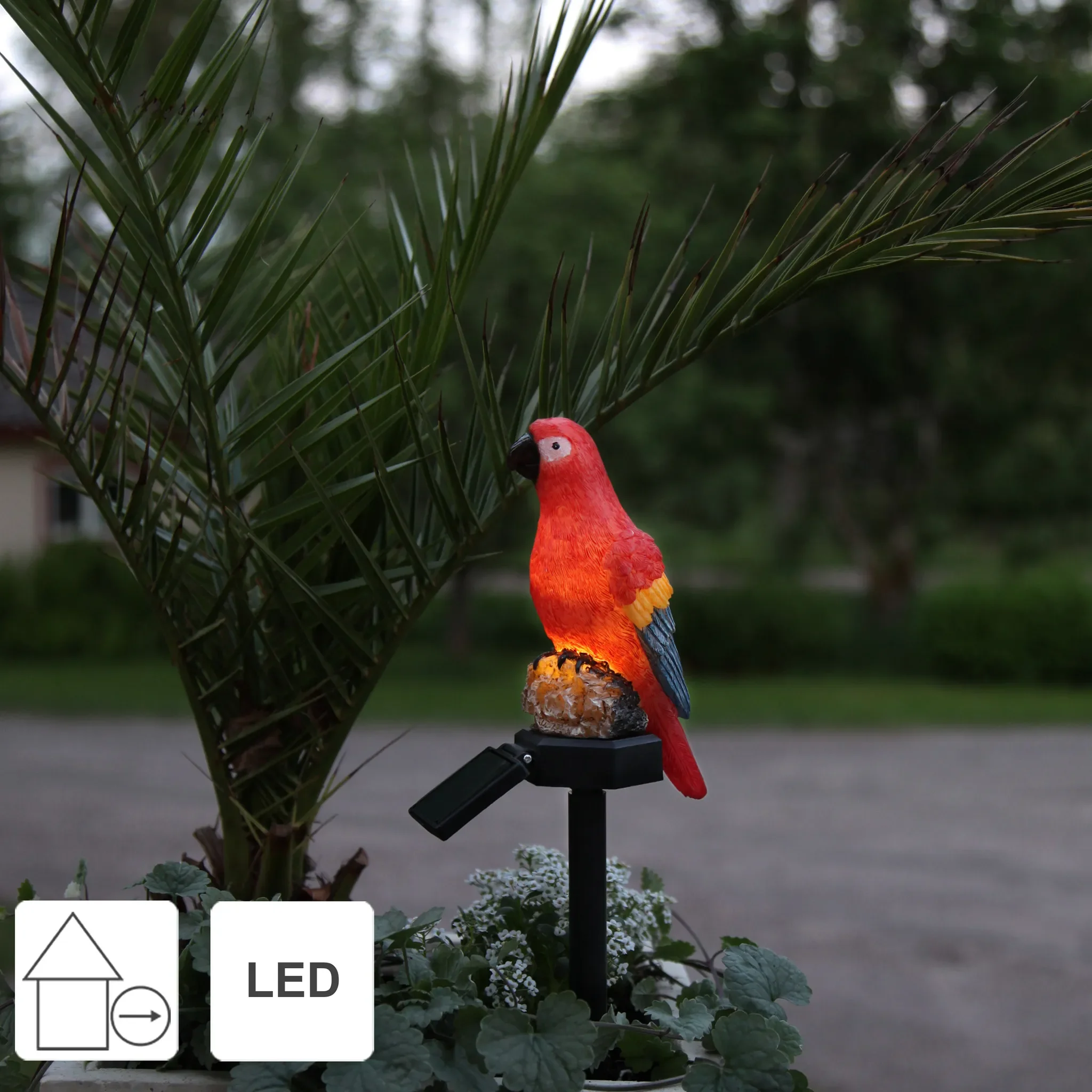 Highlights: Solarbetrieb mit Dämmerungssensor, wetterfest (IP44), kabellos & flexibel platzierbar, leuchtender Papagei im tropischen Design, warmweißes Licht für stimmungsvolle Abende.